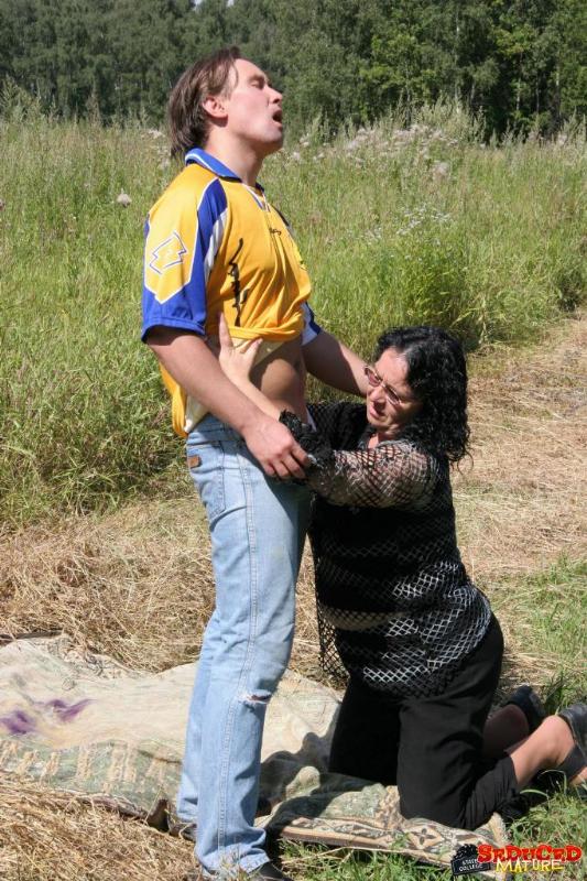 Fat old cunt fucks with a young guy in a dirty fieldbr